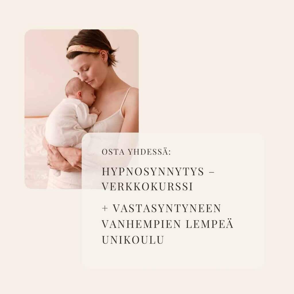 Nukkuu™: Vastasyntyneen vanhempien unikoulu on suunniteltu tiiviiksi kokonaisuudeksi odottajille ja vastasyntyneen (alle 4kk vanhan vauvan) vanhemmille. Kurssilla opit tärkeät asiat vastasyntyneen unesta, jotta osaat tukea vauvan unta jo heti ensipäivistä lähtien ja pystyt itse nukkumaan paremmin. Kurssin ensimmäisen osan uniluento sisältyy myös Hypnosynnytys-verkkokurssiin, mutta kurssilla syvennetään Hypnosynnytys-verkkokurssilla vauvan unesta opetettavia asioita ja lisäksi kurssi sisältää runsaasti uutta asiaa sekä vanhempien syvää unta tukemaan suunnitellun rentoutusharjoituksen.