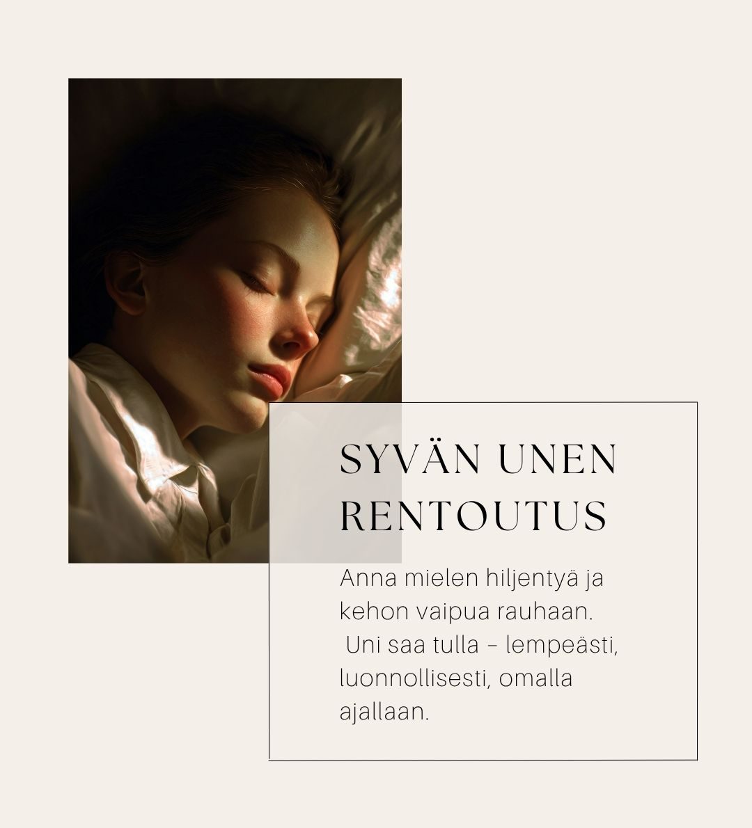 Syvän unen rentoutus on suomeksi ohjattu äänite, joka auttaa sinua palautumaan, rauhoittumaan ja vaipumaan uneen lempeästi – ilman suorittamista tai pakottamista.